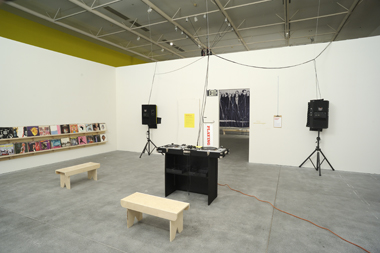 That same year, 1964, a four-year-old Blake and his father created a Pollock-esque drip painting; this forty-eight-year-old work now hangs in “Ruins of a Sensibility (1972―2002).” In this small room, filled with Blake’s enviable vinyl collection, viewers are invited to DJ from the artist’s records; the output can be listened to via an online livestream. Other structures in the exhibition—referred to in the wall text as “stations”—take further architectural cues from the interiors of gay bars.
