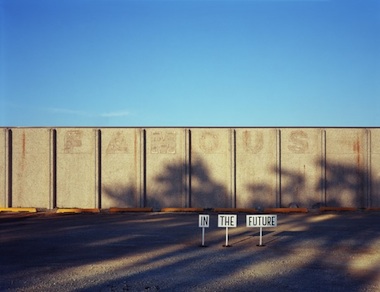 If the scene in Quiet Voices compresses the space between early decisions and late consequences, In The Future (Installed and Abandoned, Bradley, IL) (2012) further mashes together distant moments in time, again using a closed business as a backdrop. On the wall of the building, the word “famous” is a still-legible remnant of the building’s now missing signage. In the parking lot below, the artists have added the words “in the future.” Long, late-day shadows rake across the parking lot and creep up the façade. The image speaks of failure and rebirth, a return to glory that may yet come or may just be empty hubris. In expanding on the existing signage, this image represents one of the most successful combinations of an existing space and the artists’ intervention. The added words alter the perception of the place without imposing a pre-assigned narrative.