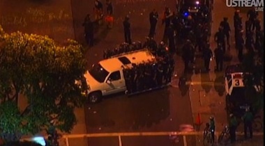 I wasn’t there last night when Los Angeles’s downtown Art Walk, held monthly, turned into a stand off with police. Instead, I was on my couch, three miles away, watching it all on CBS News’ U-stream and following updates on twitter. I dozed off when there were hardly any stragglers left on the street, just a line of police across Spring Street, waiting for orders on what to do next. The voice narrating the U-stream, who sounded like the kind of guy who always sides with the underdog but isn’t always sure which side the underdog side is, was frustrated by the whole situation: “They’re going to find out this is all a big misunderstanding,” he said. He was listening to police scanners, and telling us what he heard: “What they’re saying is, they’re just going to walk away. The cops are going to leave and let the traffic come through.”