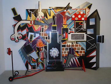 Michelle Carollo. Steampunk Davis, 2012; wood, paint, tape, marker, foam, flashing, chain, and found objects on luan; 114 x 153 x 43 in. Courtesy of the Artist and Benrimon Contemporary, New York.