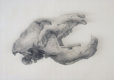 Jensen’s deceptively straightforward lithography has a certain mystifying quality to it—that much is easily said. But the reason why the clear-cut images take on such an uncanny presence, however, is not as easy to pinpoint. Perhaps it’s the peculiarity of seeing animal bones rather than the animals themselves—after all, a bear does look very different from its skull. But there’s also something challenging and bewildering in the exceptional draftsmanship of the prints themselves. The surfaces of the bones are rendered with so much attention to texture that they almost become tangible objects. Though these finer details provide a great deal of visual clarity, they also lend an abstract quality to the work, particularly in the prints featuring bone fragments instead of skulls. The four pieces in Jensen’s Season’s Suite (1999) series depict unspecified leg bone fragments from coyotes; the pairing together and flipping of twin structures creates a formal harmony that suggests seeing two sides of the same thing. Strangely enough, this revelation makes the fragments no more familiar.