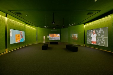 The simultaneously projected films in the Cinerama are hard to watch, but the discrete sound systems attached to each piece help to anchor the work in the physical space of the site, ultimately showcasing the strongest pieces. Ezra Johnson’s wonderful What Vision Burns (2006) combines collage with stop-motion animation of his paintings about an art heist. Laleh Khorramian‘s mysterious Water Panics in the Sea (2010), taken from her series about the five elements, makes use of multiple media: monotypes, collages, and stop-action animation techniques.In Maria Lassnig's surprising and humorous work, Maria Lassnig Kantate (1992), the artist places herself into an environment made up of her own drawings and paintings.