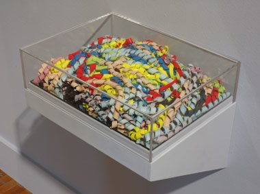 The works by Susan O'Malley, Leah Rosenberg, and Christine Wong Yap exude a generosity of color, activity, and tangible object (as in Rosenberg’s giveaway Seed Confetti, which, sadly, were all gone by the time of this writer’s visit). The artists tap scientific, linguistic, and chromatic conventions in a quest to conjure and gently question the constructs and conditions of positive emotional states (as diagrammed in vibrant hues in Wong Yap’s 2012 chart-like drawing, Positive Signs: United Theories). The gallery brochure cites a niche therapeutic approach called Positive Psychology, which emphasizes quantitative research into the experience of happiness. In the case of the exhibition, employing that methodology doesn’t exactly lead to important new findings, but it does offer thoughtful pleasures.