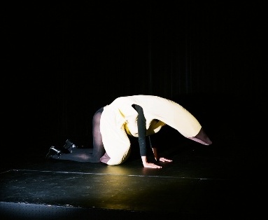 Carland’s photographs, all titled I'm Dying Up Here (2010), depict bare stages curtained with black velvet, either vacant or with a lone female performer. The empty stages covered with glitter streamers and a dilapidated drum riser effectively convey bleakness through minimal means. Meanwhile, an anonymous female, her face hidden, is caught in the midst of performing a series of absurd acts. In one, she is on her knees