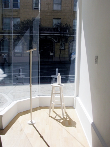 With the current ubiquity of female comedians, from Sarah Silverman to Ellen Degeneres, it’s easy to forget that there was a time when comedy was a boy’s club. Though female comedians existed before Burns and Allen, it was no doubt a much more challenging and lonely profession for women than it is now. Tammy Rae Carland engages this history through photographs, text pieces, and sculpture in her current show, Funny Face, I Love You, at Silverman Gallery. In the gallery window the artist positioned a microphone stand, stool, and water bottle—the basic tools of the comedy trade. Cast in white porcelain, these objects take on an elegant, elegiac quality; transcending their mundane existence, they stand as monuments to a loss of self and isolation. Using the legacy of female comedians as a starting point, Carland explores larger issues of power and alienation.