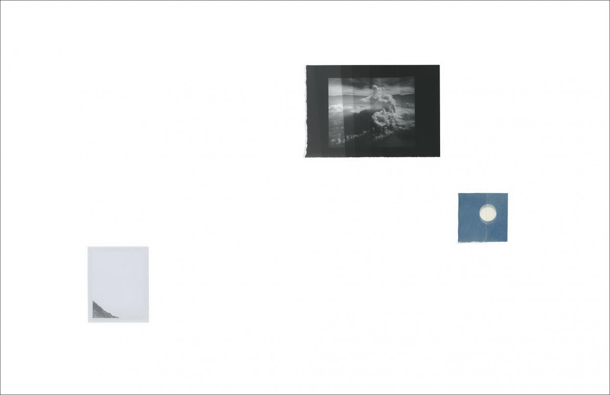 Perhaps the most overtly manipulated photographs in the exhibition are several images McFarland made without a camera. Day Moon, for instance, is a series of small images of a white orb on a blue background. Here, the artist simply placed a penny on photo-sensitive paper, moving the penny halfway through the exposure to create a slightly blurred, moonlike sphere. Arranged against a white backdrop, a group of these resulting cyanotypes seem to document phases of the moon. The adjacent Nine Horizons is a collage of nine black-and-white Polaroids depicting a sky at sunset. McFarland achieved this gray-scale effect by leaving the film for various exposure lengths in an old Polaroid camera with a severe light leak.
