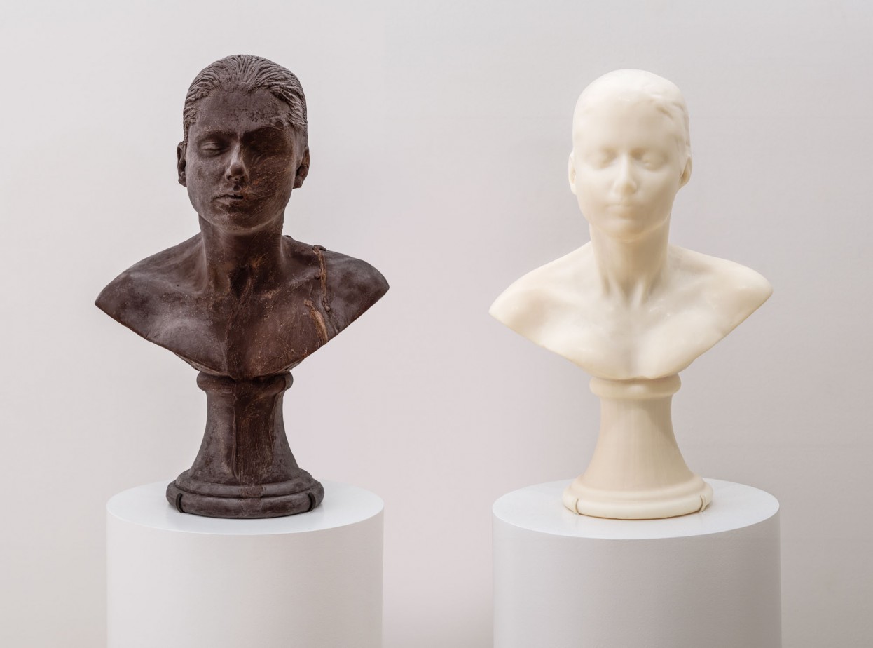 Janine Antoni, Lick and Lather, 1993-1994; two self-portrait busts: one chocolate and one soap. Collection of Carla Emil and Rich Silverstein and San Francisco Museum of Modern Art. © Janine Antoni.