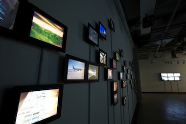 The only break to the rhythm consists of two live feeds of the world just outside the gallery. One single screen is placed along the floor and shows the parking lot on the other side of Fifth Street and the other, a set of six screens featuring a single image of the world across Mission Street. So here you are—viewer. As one watches the other screens, one tries to find traces of Elahi; but watching these flat screen windows, one finds oneself—not being watched, but apparently seeing through the walls. This x-ray vision plants the viewer in space and time, and reminds her that most of these images flashing by are a spectacular kind of re-run. The camera informs and connects, but it also separates us into the worlds we inhabit, the viewer and the viewed.