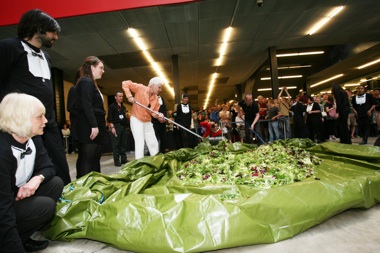 TC: The purpose of working with food, in most of these cases, was to create a sense of community, to sit and talk to people, and what’s left is a temporary bit of residue—the point is really about the social engagement. I didn’t get the sense that the social engagement was central to [Rirkrit’s work]. Alison Knowles’ intentions were somewhat different; with her salad piece, there was this level of engagement that happened, and the food was, in some ways, the gift at the end.