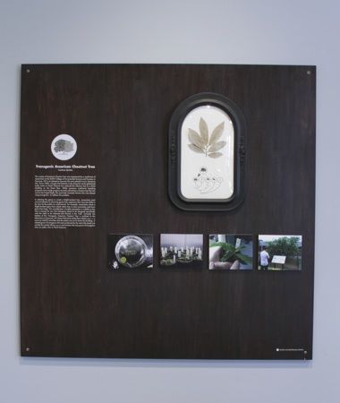 Center for PostNatural History. Transgenic American Chestnut Tree Display, 2012; chestnut specimen, photographs. Courtesy of the Artist and Southern Exposure, San Francisco.