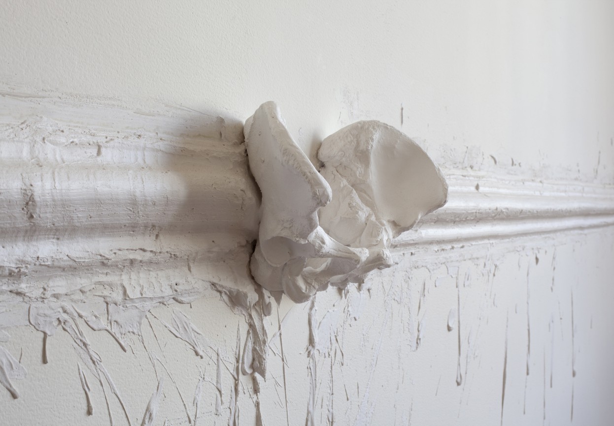 The result is at once stark and evocative, minimal and sweeping. It manages to exist as refined in itself while also interfering with the drawing-room refinement of the original bourgeois dwelling and its meticulous renovation. It does so with the final gesture of inserting a more palpable presence among the handful of other details from the original architectural design: the pelvic bones themselves, which confront and implicate any viewer who steps into the room.
