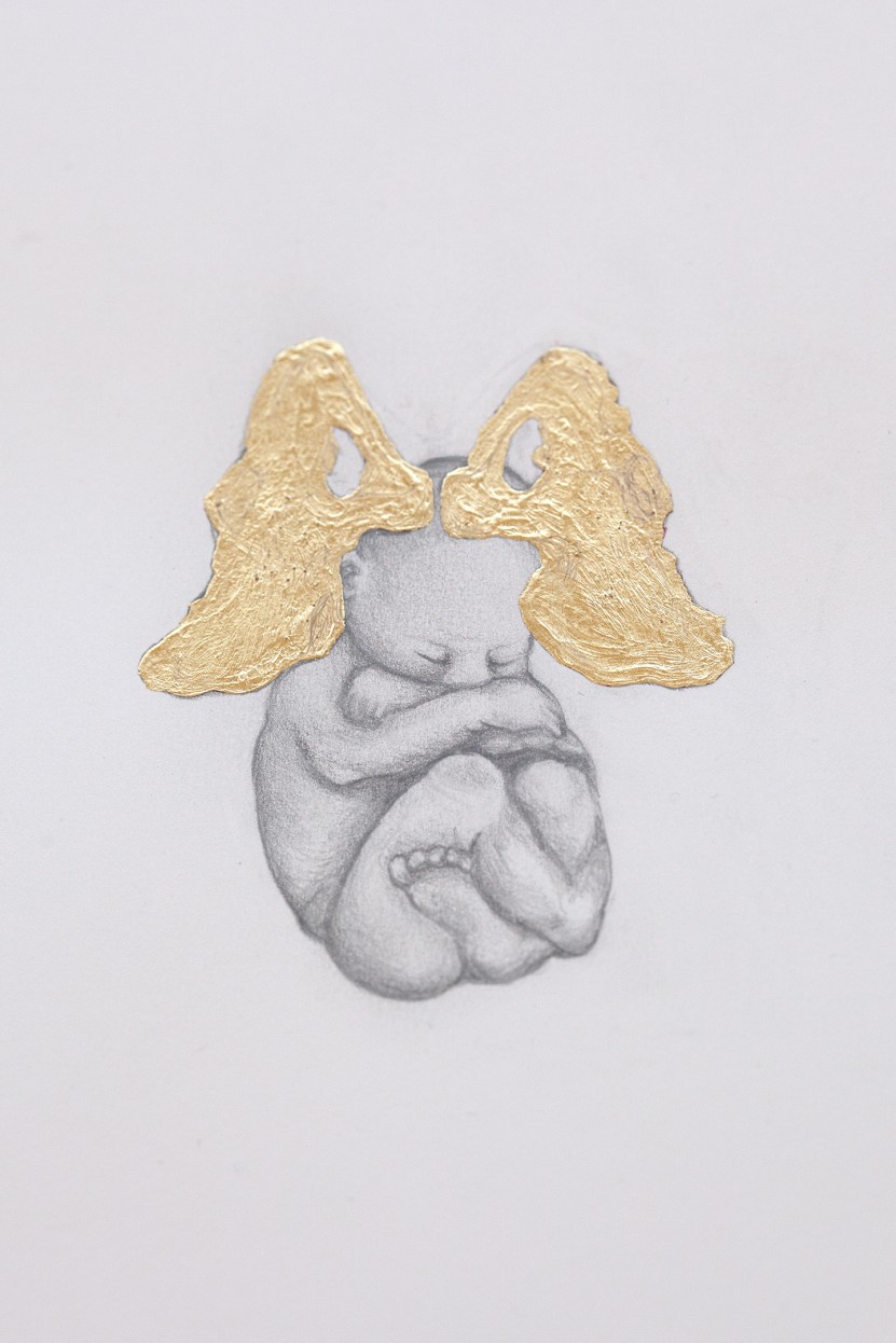 February 27 - April 3, 2015 Solo ShowUpon entering Anthony Meier Fine Arts to view Janine Antoni’s exhibition Turn, visitors are confronted first with a single small drawing set high on the wall above eye level. Floating in a modestly framed large white field of paper, the drawing Corona (2015) depicts a curled-up homunculus figure—a mature-looking fetus—its head set in front of detached pelvic bones, hovering as if they were a pair of wings. Their positioning creates a halo effect around the head of the figure, appropriately introducing the show’s theme of birth crowning—when a baby’s head starts to emerge and is surrounded by the mother’s birthing body.
