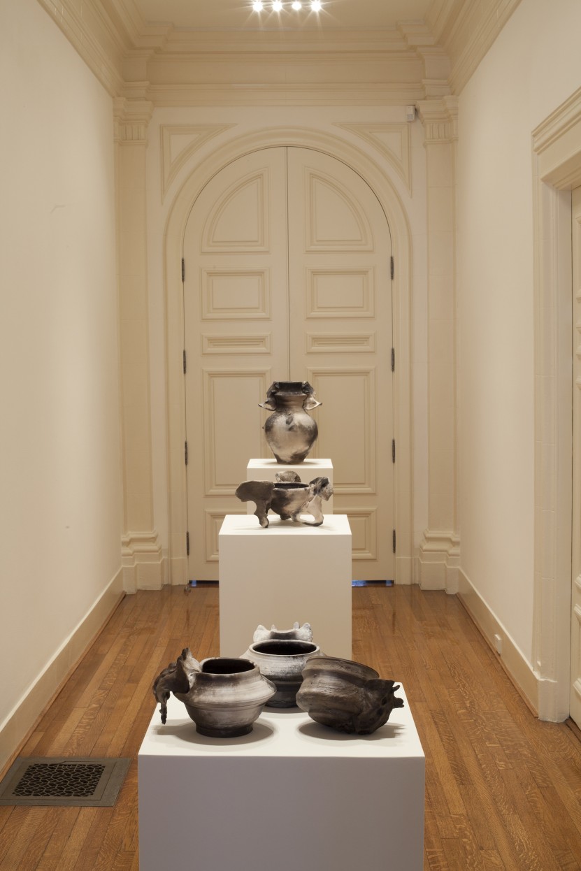 Top to bottom: Janine Antoni. Rosa, 2014; pit fired ceramic; 18” x 13 ½”; edition 2 of 3 with 2AP. Janine Antoni. Mary, 2013; pit fired ceramic; 14” x 7”; edition 3 of 3, with 2AP. Janine Antoni. Hearth, 2014; set of three pit fired ceramic vessels; 4 ¾” x 6 ½”; 4 ¾” x 7 7/8”; 5 1/8” x 8”; edition 2 of 3, with 2AP; installation view at Anthony Meier Fine Arts, San Francisco. Courtesy of the Artist and Anthony Meier Fine Arts. Photo: Keith Petersen.