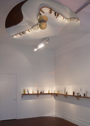 Jars Filmed Inside, 1980–2010; installation view. Background: Jars Filmed Inside, 1980–2010, overhead: detail of Buoy, 2010. Courtesy of the Artist and Triple Base Gallery, San Francisco.