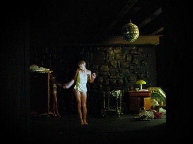 This haunting installation—Sonja Nilsson’s Silence of the Lambs (2008)—formally mimics Paul Pfeiffer’s Poltergeist (2000). Both consist of scaled-down horror film sets recessed into gallery walls. Nilsson shares Pfeiffer’s predilection for small video projections, but while Pfeiffer’s work comes off as detached and analytic, Nilsson’s embraces the viewer’s experience, implicating them as voyeurs and marking their vision with her ghostly silhouette.