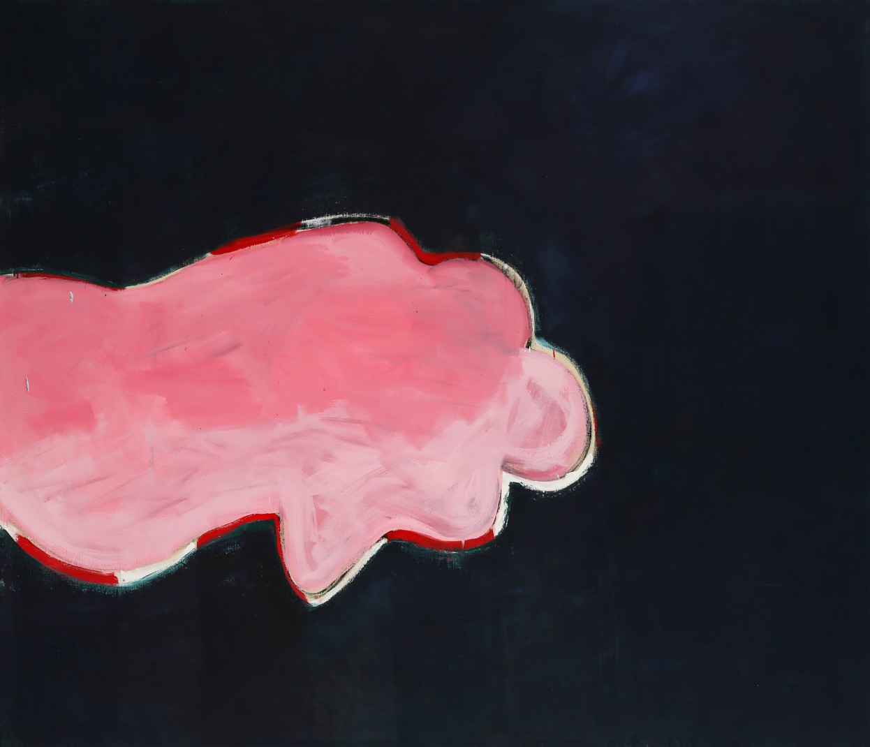 It would be all too easy to describe the image as unfinished. In labeling her model as “partially painted,” however, Brown not only subverts expectations of what an complete/incomplete painting should look like; she also challenges conventions of figuration that presume a certain level of formal realism. The errant brushstrokes become the mark of the artist’s hand, but they also signal Brown’s own attempts to de-familiarize—and even abstract—traditional modes of representing the body. The Lovers #2 challenges those conventions even further, the amorphous and freeform pink and white shape in the foreground standing in for the figurative models from the works on paper (which have the same pink flesh/black backdrop color scheme as the canvas itself). Traces of human forms still remain—the curve of a shoulder, the soft roundness of a head, the indented angling of an arm—which makes the abstraction of the body in these works even more profound.