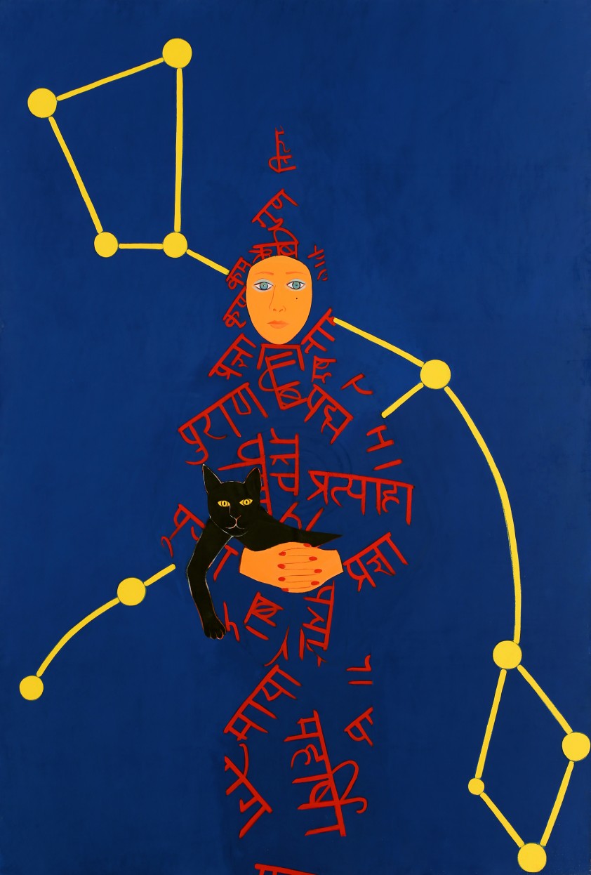 These forms, however, become infinitely stranger in Summer Solstice, in which Brown composes her own body out of red Sanskrit letters. Historian Karen Tsujimoto notes that the repeated representation of symbols in the later works—from the Sanskrit letters here to the zodiac imagery in Year of the Tiger—stemmed from Brown’s increasing distrust of the commercialization of the art market, a distrust that in turn led to her own search for faith and introspection through the study of ancient religions.2 Insofar as these symbols function as highly personal markers of Brown’s spiritual self-discovery, they also evince a continuation of her inquiry into representing how bodies are composed of both material substances (flesh, blood) as well as immaterial matter (language, belief). The image of her Sanskrit-covered body represents her fully embodied commitment to her faith, while also marking her body as an object that can be translated and read as if it were a text, in turn making herself even more vulnerable to the viewer’s gaze. It’s a startling representational shift that establishes a felt (if imagined) intimacy with the artist’s physical and interior selves.