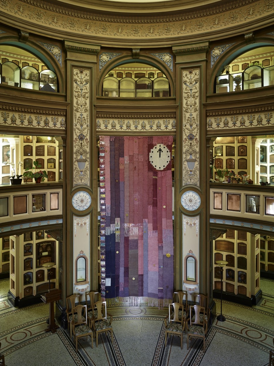 September 14 - November 18, 2013 Art Practical PickBE BOLD For What You Stand For, BE CAREFUL For What You Fall For, Josh Faught’s vibrant textile work, spans two of the three stories of the Neptune Society Columbarium’s central atrium. The weaving is one of three site-specific works seamlessly integrated into this idiosyncratic final resting place in San Francisco’s Richmond district, and formally and thematically it echoes its surroundings. The title is a hackneyed adage that nevertheless rings true, a fitting phrase to encapsulate an installation that, like Faught’s earlier work, combines irreverence and solemnity, kitsch and sincerity. Faught was one of four artists, along with Zarouhie Abdalian, Jonn Herschend, and David Wilson, chosen for the San Francisco Museum of Modern Art’s Society for the Encouragement of Contemporary Art (SECA) Award in 2012, which features off-site projects during the museum’s closure and expansion.
