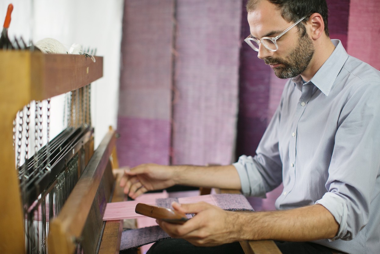 Josh Faught at the loom in his former studio in San Francisco (in background: work-in-progress to be installed in the Neptune Society Columbarium, San Francisco). Photo: Andria Lo.