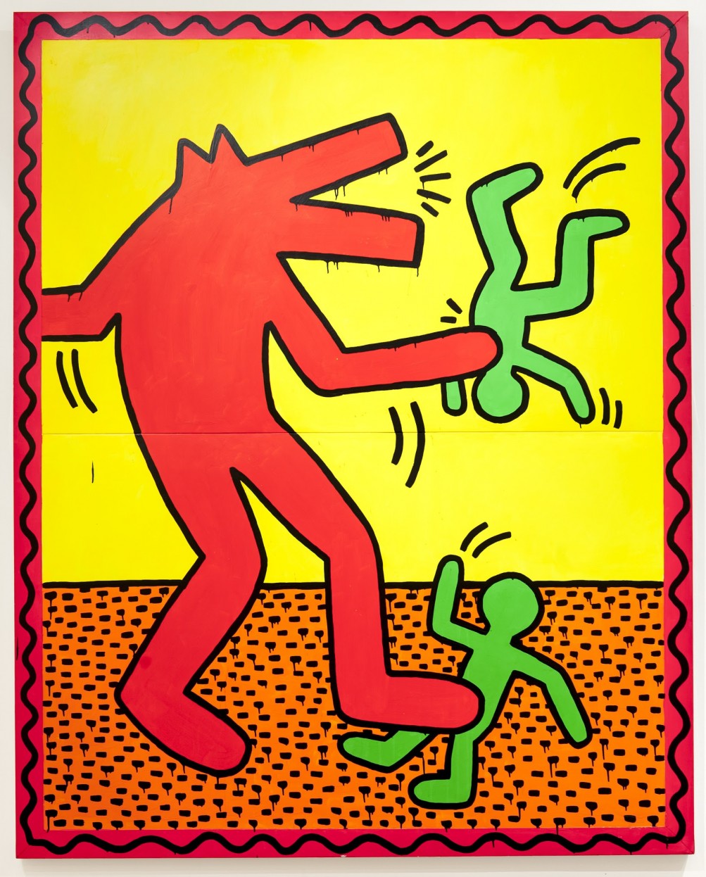 Another exhibition room houses three works on vases by Haring, of which he made several during this career. The black ink on terra-cotta of one untitled piece from 1984 harkens back to Athenian vase painting, in which depictions of the everyday rituals of ancient Greek life were often as educational as they were decorative. Haring’s vase features sections of imagery separated by a snake wrapping around the vessel from the bottom upward; its mouth appears to be chasing running figures. The characters on the vase are both playful and brooding. A telephone, larger than the human figures, “rings” off the hook, almost smashing the figures around it. Nearby is a menacing dog-headed figure. The composition is a swirling panorama of recurring themes in Haring’s work and a playful spin on a precious art-historical object. Further along, an entire section of the exhibition, one that contains some of Haring’s most prescient work, is dedicated to “Mass Media and Technology.” Images of televisions and computers are portrayed almost like religious icons, objects that humans are so quick to believe in, worship, and rely on. In several works, a television is merged with the figure of a human or animal, creating menacing cyborgs that emphasize the systemic power media has over society. The context of this room is confusing. Is being critical of television the same as being political? It seems making work about it may be a political action. Though in a room full of Mickey Mouse images and Haring’s iconic figures, it is difficult not to feel that Haring has succeeded in hammering his own brand of message into the American psyche.