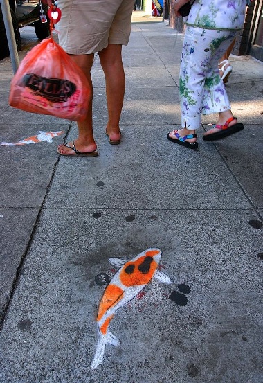 Viewers observe these life-size stencils from above, which contributes to the illusion that the fish are gliding through water, instead of along the surface of the sidewalk. One recognizes Koi as decorative elements that add to the atmosphere of quiet ornamental spaces like the Japanese Tea Garden. They are out of context in the city, which is marked by the quick steps of passersby; because the Koi are unexpected, viewers often stop or double back in order to assimilate their image into their incongruent surroundings.
