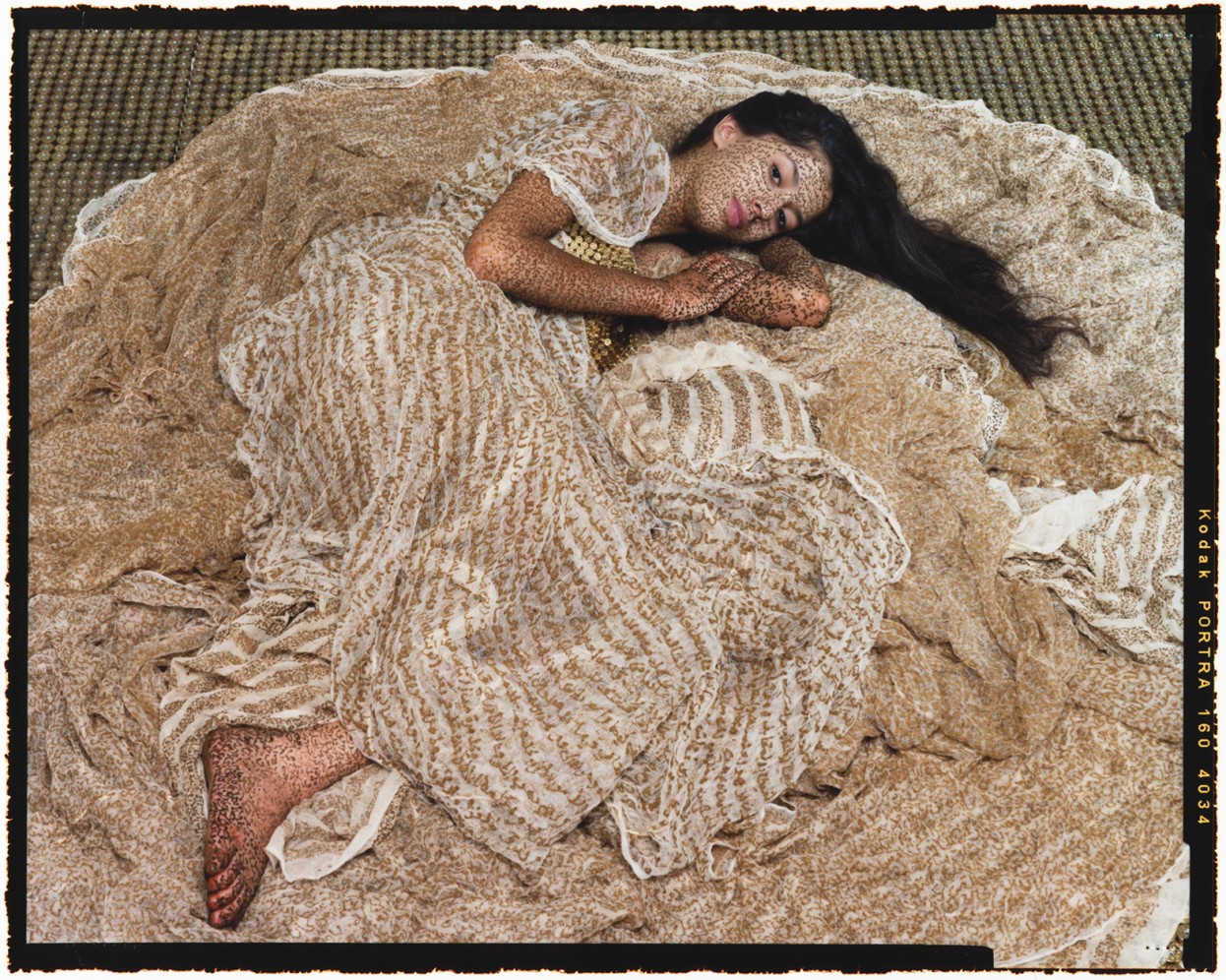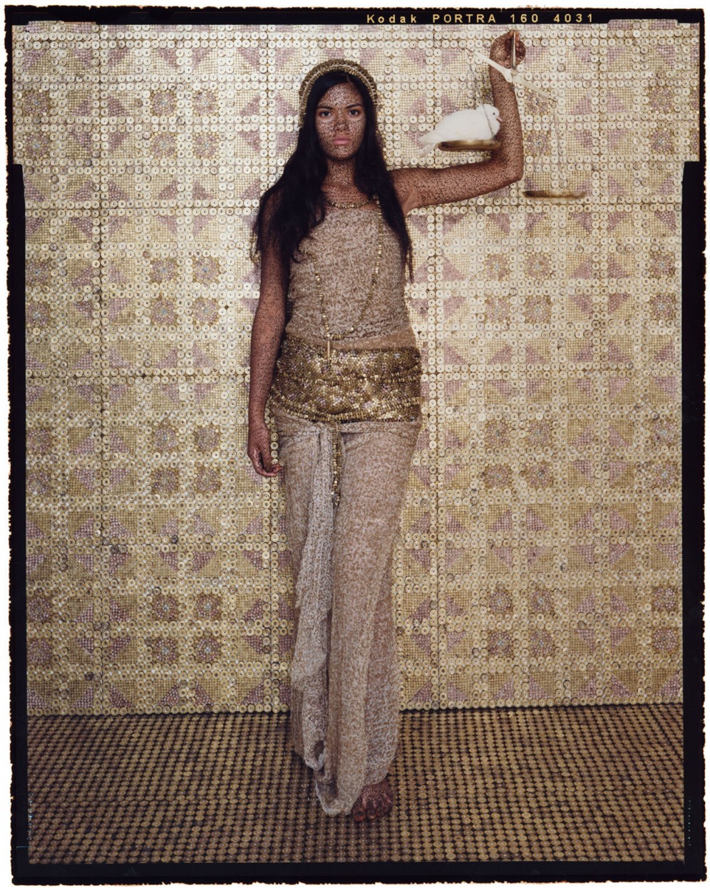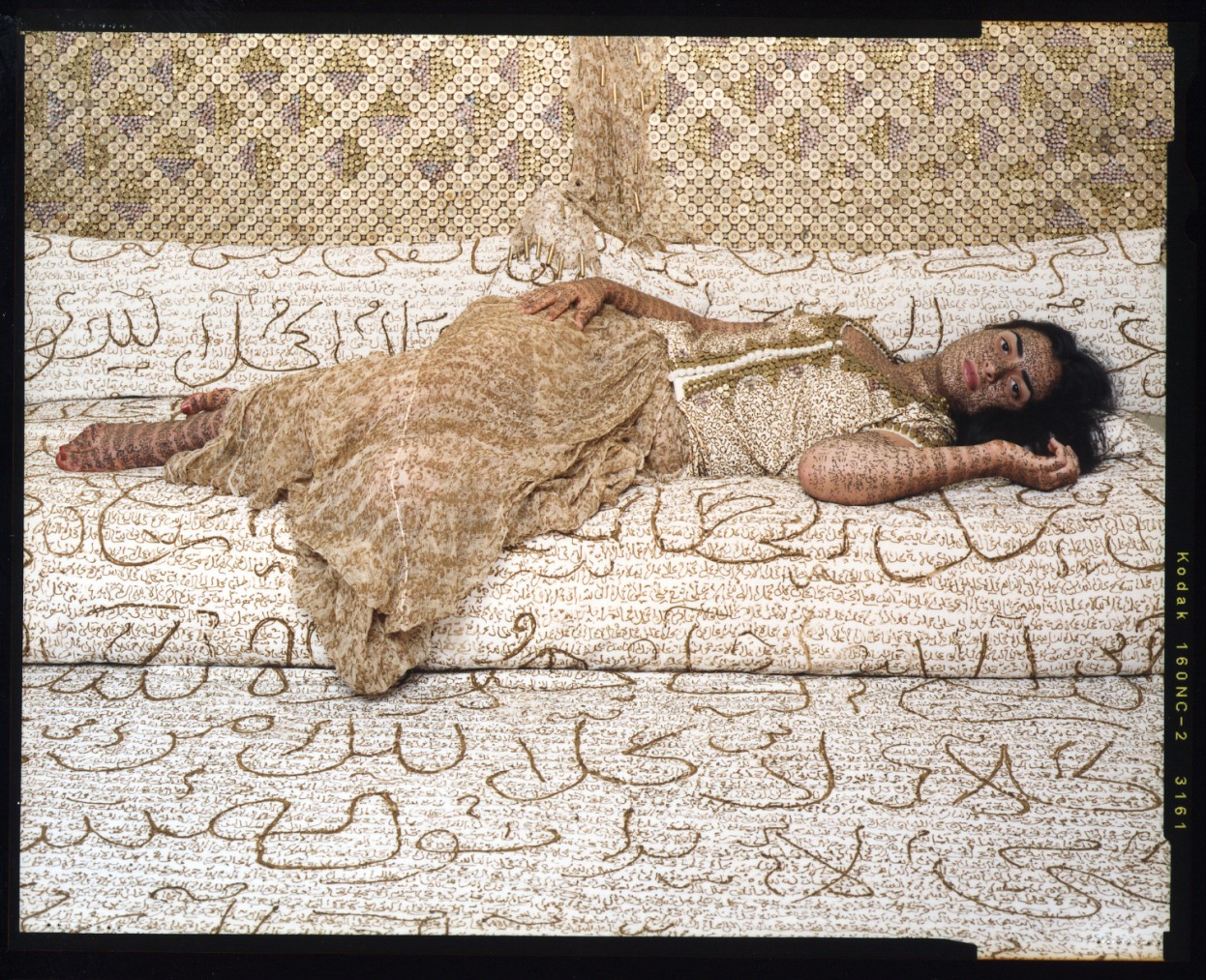 Bullets #5 (2009) employs a similar visual language, but with a more sinister tone. Disappearing into a divan both printed and embroidered with Islamic text, the model is also covered from head to foot in calligraphy, from the hennaed inscriptions on her face and arms to the gauzy fabric of her skirt. Trimming the model’s top are decorative “coins” that are in fact bullet casings. For the Bullets series, Essaydi uses a labor-intensive process to weave her own fabrics from discarded casings. The resulting garments are enormously heavy, literally weighing down the bodies of Essaydi’s models with the physical remnants of gunfire.