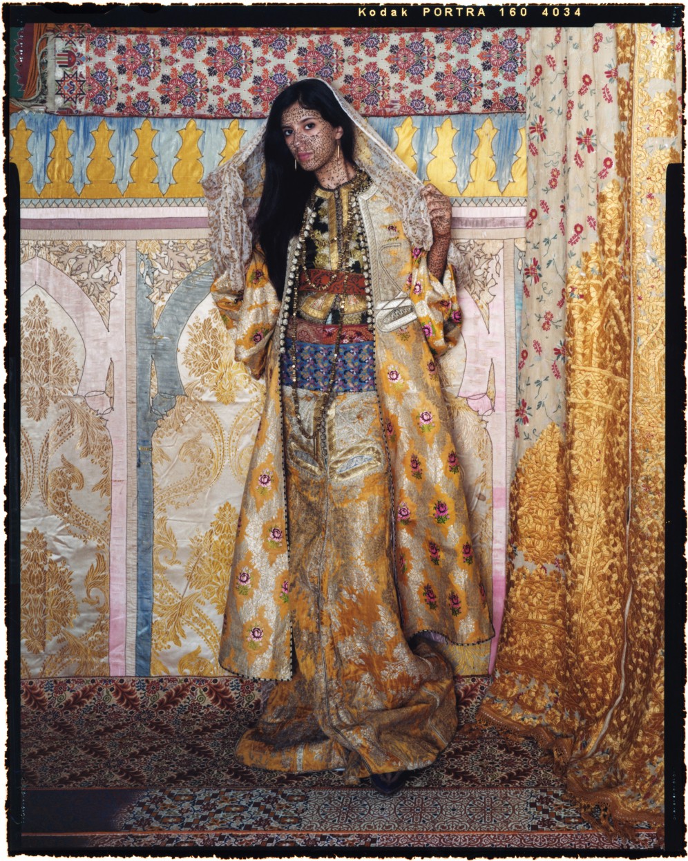 Essaydi’s large-format chromogenic prints, all shot in the isolated space of the harem in palaces and homes around Marrakech, are visually alluring. The pictured women glint with gold clothing and jewelry made from bullet casings, or are swathed in intricately adorned fabrics in saturated hues. For the models’ poses and groupings, the artist references an art-historical lineage that includes 19th-century painters Jean Auguste Dominique Ingres, Jean-Léon Gérôme, and Eugène Delacroix, twisting familiar imagery into disconcerting scenes.