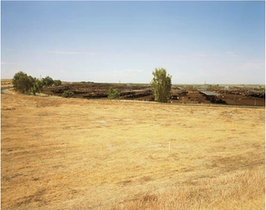 September 10, 2010Bill Mattick’s understated, gracefully composed photographs of rural and suburban landscapes set the tone for Land Use at Swarm Gallery. Using a deep field of focus, each image presents many registers of organic textures divided by hard, man-made lines. Avoiding a pat distinction between the natural and the artificial, Mattick instead documents an ironic range of visual juxtapositions. In 329(810) (2008) he situates jumbled dirt tracks from farm equipment amongst orderly fields of uniform crops. Mattick depicts a contained, dense swath of cattle in a feedlot above the sparse, dead grass on a nearby embankment in 371(810) (2006), and picking out a skeletal windbreak row of trees around a rest stop behind a field of arid scrub brush in 322(810) (2005). These relationships make clear that our way of life is made possible by intervening in the land we live on, but they also question how long we will be able to maintain our current intensive use of resources.