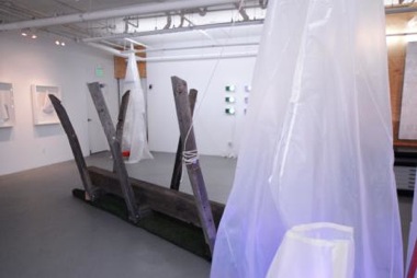 skeletal structure made of salvaged wood, its long spine resting on a green bed of Astroturf. This is the Lapidary Terrarium from which the show’s title derives. This assemblage is reminiscent of Mark Dion's Neukom Vivarium permanently installed in Seattle's Olympic Sculpture Park. However, Conrad's work does not convey the vitality of Dion's hemlock tree, which is embedded in soil with a constant source of water, air, and humidity. Instead, her abstract assemblage is bareboned. As the title suggests, it is living, but only in relation to its contrived and isolated environment.