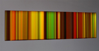 Linear Shadowbox (2011) is a print of a similarly striped pattern, made on a transparent material and mounted in a custom-made display box. Enabling the print to loop in three dimensions, this presentation directly incorporates the visible walls and works in the space on either side of the piece, creating a situation in which a viewer’s movement and vantage point produce color and tonal interactions between different parts of the print itself.