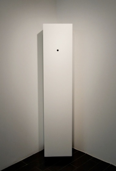 After experiencing a few rotations of the mechanical arm, one is compelled to move to the second room, a small, well-lit, square space with the multimedia installation Mountains of Instead (2013). Facing the viewer at a 45-degree angle, nestled between two walls, is a 66-inch-tall white box. The only indication that there is more than a vacant podium in the room is the small round eyehole, placed in the center of the box. Mountains of Instead evokes aspects of Marcel Duchamp’s Étant donnés, a permanent installation at the Philadelphia Museum of Art. Both works have a peephole through which a diorama with an unexpected subject is visible: in Duchamp’s, the torso of a nude woman, rendered in wax and plaster, resting on a mat of hay; in Biernoff’s, static figures of horses and a digital projection of a unicorn. While the comparison is humorous, the shared effect of the two works is what resounds most strongly—capturing the imagination in a moment of suspended, almost quixotic, belief. As a viewer peers through the peephole, Biernoff’s tiny unicorn stamps for attention but receives none from the horses that graze in the foreground of the diorama. The bright and crisp image of the unicorn is almost confusing as it connects a motif from the mimetic Internet culture to an archaic form of display, the natural history diorama.