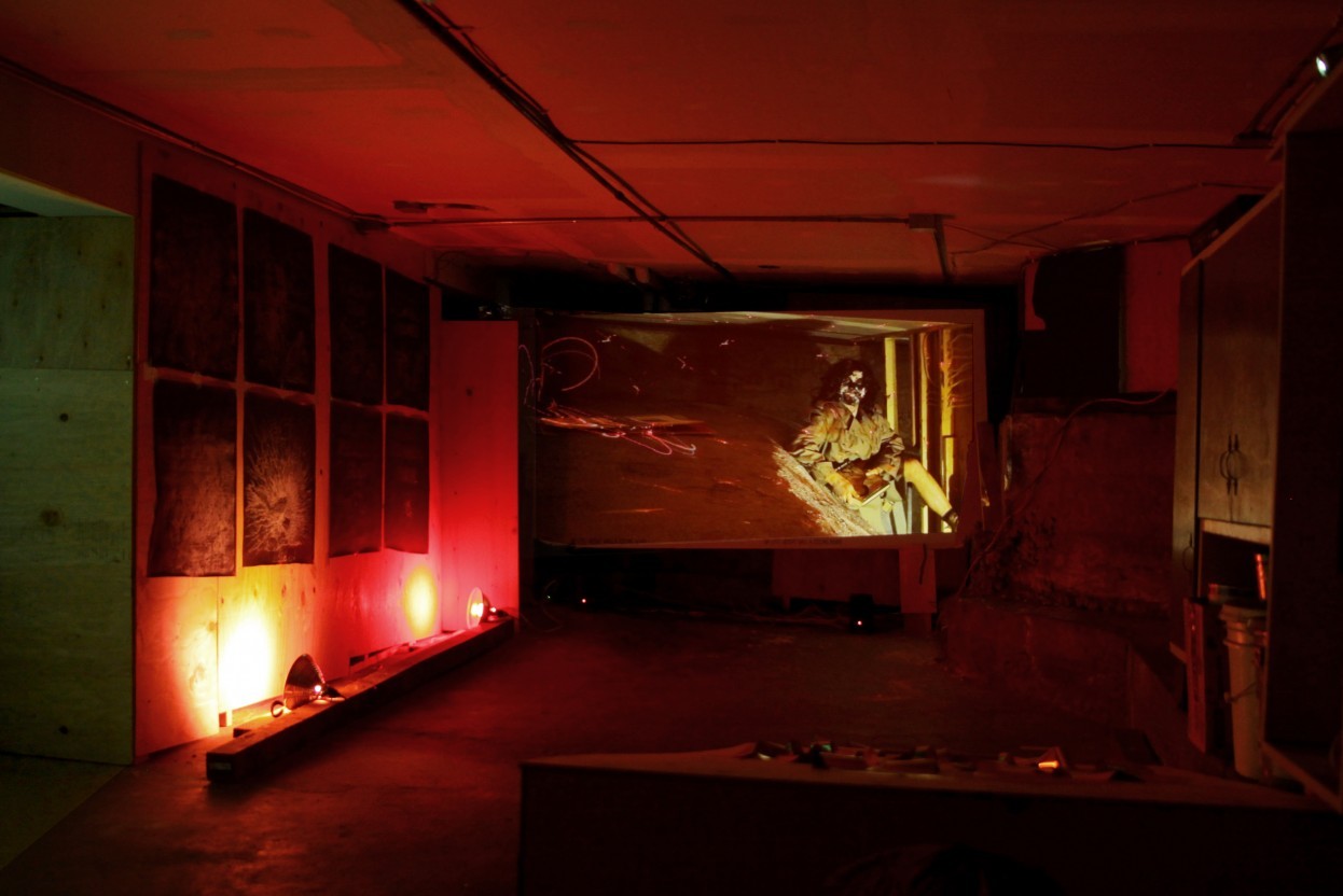August 29 - August 31, 2014 Solo ShowRelieved to be in the physical world, away from a computer screen, I travel on a Friday evening to a quiet residential street in Bernal Heights and duck under a black tarp into a narrow, low-ceilinged garage. For a short while, I’m alone with the work: a tight display of video, sculpture, and drawings. To my left, a cement crawlspace is cast in the glow of red disco lights. To my right, a plywood ramp is draped in strips of gold foil, proclaiming itself “THE TOMB OF THE APHALACEPHALE.” Ahead, looped projections and a grid of drawings line the garage walls.