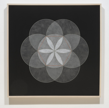 Badger seems to share Holt’s interest in both science and mysticism. Two paintings, Hexagon Construction and Pentadecagon Construction feature the Flower of Life, an ancient symbol of sacred geometry, a thought system that conflates mathematical purity, perfection, truth, and patterns in nature. Badger, however, depicts the Flower of Life as the product of mathematic relationships that don’t seem, on the surface, to support the same transcendent claims to the motif’s significance that New Age writers have more recently ascribed to it. Viewed together, this collection of work points both inward and outward simultaneously, not only ostensibly examining cold and remote celestial bodies in space but also contemplating the history of astronomy, physics, and mystical representations of those same bodies. The work holds such seemingly paradoxical modes of thought as mysticism and mathematics, intuition and empiricism, and aesthetics and scientific representation in careful balance.
