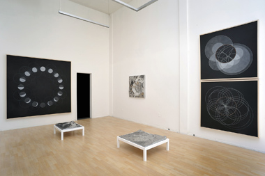 Similarly, the paintings—done in oil and chalk on black-gesso panels—reference in their scale, arrangement, and overall appearance the sort of blackboard diagrams frequently used to illustrate academic science lectures. Decagon Construction hangs directly above Pentadecagon Construction, recalling both the blackboards hung in a similar manner in classic ’60s or ’70s photographs of the physicist Richard Feynman’s lectures and the minimalist display practices of the same era by artists such as Daniel Buren, Robert Ryman, and Donald Judd. Each of these paintings bears a number of concentric rings and intersecting lines, usually including a polygon; each illustrates a variety of mathematical relationships that are presented cleanly and precisely but are not explicitly labeled except perhaps by the piece’s title. The geometric information is being presented but not illuminated. Many sections are handcolored with Badger’s uneven but consistent marks, which create pleasing gradients and emphasize each composition’s flat abstraction. Shadow Phase (2013), the largest painting, and the only one not explicitly titled in relationship to its central geometry, portrays the familiar phases of the moon, with additional lines indicating epicyclical orbits or astronomical transits. Alternately, the piece can be read more abstractly as a map of flat, tangential relationships or symbolically, bringing to mind both the historical astronomers Tycho Brahe’s and Johannes Kepler’s diagrams, which attempted to prove Copernican astronomy, and Nancy Holt’s Dark Star Park (1984), an earth work that simultaneously illuminates and mystifies the human relationship to celestial bodies.