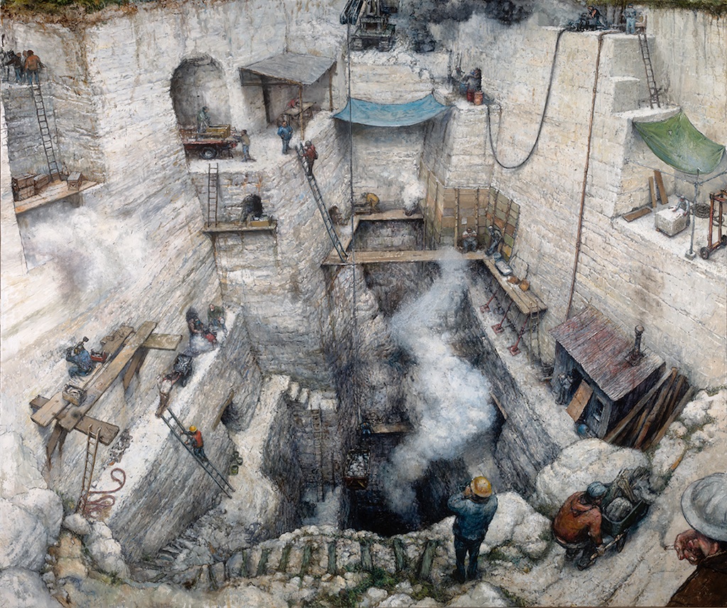 In At the Bottom of the World (2014), we are the omniscient viewers of the depths of a mine’s pit, a scene that suggests a high-rise building project in reverse: like de-construction workers, the miners are engaged in a continuous (and seemingly precarious) process of making negative space. Under a green tarpaulin at right, a man leans over a massive block of stone. (Arnold has cleverly situated his signature and the date in an inscription carved on the side of the block.) Improbably, a rat skulks nearby as other workers eat, smoke, hammer at the walls of rock, or perch on ladders and scaffolding, their Bruegel-esque ballet of activities orbiting around a deep, black, seemingly bottomless hole. A wisp of smoke emerging from the depths hints at the unseen, hellish world far below.