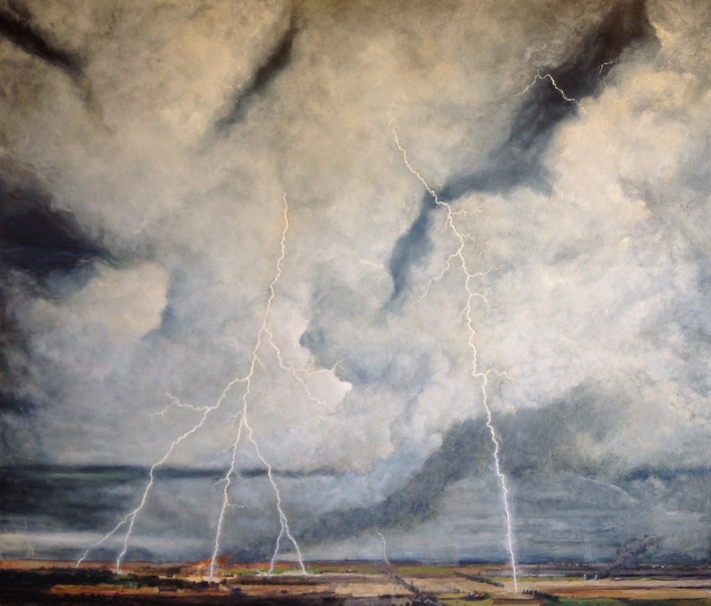 The title of the exhibition comes from a poem by Arnold that is inscribed on the back of one of the paintings. Several works apparently bear such writing, though most viewers are not privy to these texts. Having seen a picture of the verso of A Hawk’s Attention (2015), a spectacular vision of forked lightning silhouetted against roiling clouds, I can suggest an interpretation of the title’s meaning. The poem reads: “Blinding lines of / Lightning strikes / marked steadily across the plains, / and with their strobing, / Thunder. / We knew it all would pass, as weather will. / But knowing this could not subtract / a watt of thrill from what made watching wondrous. / Now, / A fact finds meaning in a flash— / and if one doesn’t pay a hawk’s attention / nothing will be gained or learned / In dark’s descent.” This text suggests that the violent lightning storm depicted is both a natural phenomenon and an allegory for how closely we must pay attention to both the startling spectacle of modern life and its shadow side.