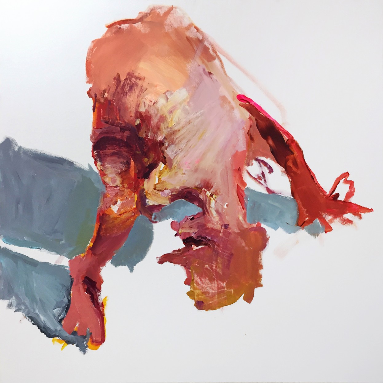 Some of the works explicitly express sad passion and melodrama. In Let Me Get That For You (2015), the figure in the painting bows before the viewer on his knees. Thick acrylic paint gathers in density and intensity of color around the arms. These dual agents of obsequy become the feverish epicenters of this painting. The intensity of the abject and pathetic figure on his knees groveling for one little taste of your love is offset by the title, which exudes the casualness of someone picking up a dime you dropped.