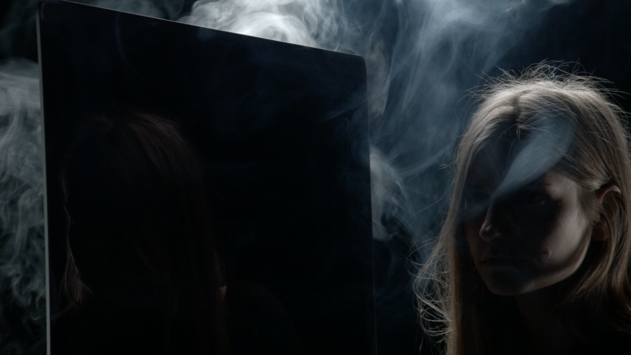 The Sprawl is too dense a work to be sufficiently contained by a single installation, and YBCA’s exhibition forecloses those chances for interactive viewership that made its impending web release so compellingly expansive. But there are flashes of clarity throughout. The most resonant moments in the film are a series of wordless vignettes featuring actors blankly staring into flat-screen monitors, their faces mirrored back like ghostly avatars. These brief scenes have a startling echo in YBCA’s installation: mirrored surfaces mounted on the columns’ backsides reflect the viewer’s face, the red moon lingering in the background. In these moments, Metahaven poetically suggests that trauma’s real origins aren’t found in the images on screen—they’re located within ourselves and in our inherent capacity for perpetuating violence in the world around us.