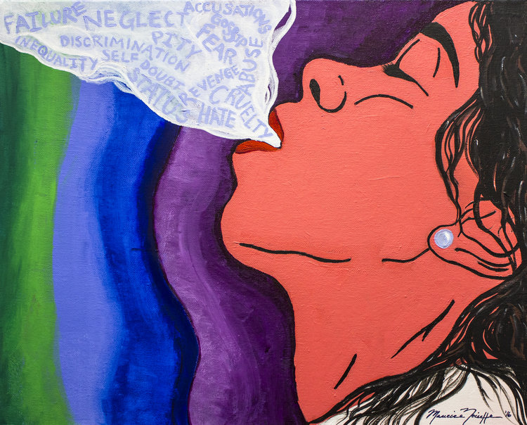 Release, a comic-like acrylic painting, calls me to relax and let go of the day. As I stretch my eyes back, the inverted profile of a salmon-toned woman of color comes into view. Her wavy dark hair rests behind her ear, revealing a pearl earring, and like my own, her head is thrown back, her neck exposed and eyes closed. Several lavender words like “cruelty,” “revenge,” “neglect,” and “failure” blow from her red lips in a white plume, as if they were speech bubbles. Foucault analogizes the act of confessing to sexual orgasm;1 MoNoise draws a similar comparison between sensual release and speaking one’s truth.