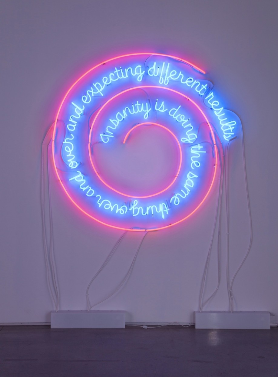 Mungo Thomson. Wall, Window or Bar Sign (Insanity Is Doing the Same Thing Over and Over and Expecting Different Results), 2014; neon; 59 x 55 in. Courtesy of the Artist and Kadist Art Foundation, San Francisco. Photo: Jeff Warrin.