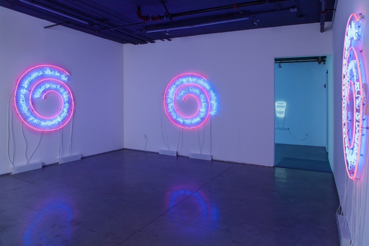 The impulse when walking through the exhibition is to move quickly: The six neon sculptures, commissioned for the exhibition by Kadist, share an identical peach spiral and blue script with different texts. Like Nauman before him, Thomson does not hide the technical apparatus (the white wires that connect to the transformer plugged into the wall), but rather leaves exposed the electrical elements that make the sculpture operate. Though large-scale, almost like glowing mirrors, the sentiments expressed in the exhibition, such as “As you go through life make this your goal, watch the donut not the hole," ring hollow. Thomson’s hackneyed texts are so immediately identifiable to viewers as to be meaningless.