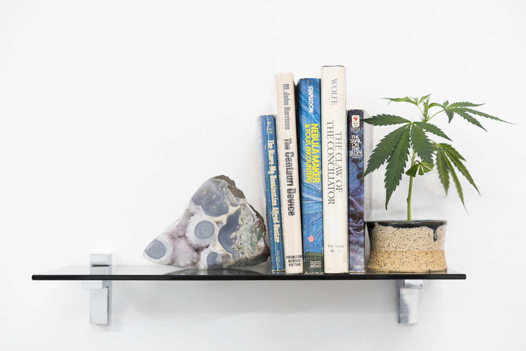 Nando Alvarez-Perez. Existential Coping Complex II (City of Illusions), 2017; chalcedony sourced by Anna Nearburg, ashtray by John Zane Zappas, dye-sublimation print on aluminum, tempered glass, chrome brackets, blue chalcedony, The Snail on the Slope by Boris and Arkady Strugatsky, Nebula Maker and Four Encounters by Olaf Stapledon, The Centauri Device by M. John Harrison, The Claw of the Conciliator by Gene Wolfe, The Stars My Destination by Alfred Bester, ceramic vase, Purple City Shapeshifter marijuana clone, soil, wooden ashtray, sativa ash, ceramic tile, found images, Polaroid; 50 x 30 in. Courtesy of the Artist and Interface Gallery.
