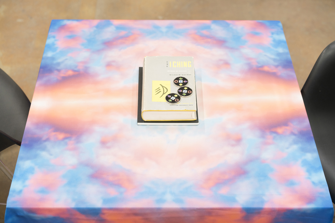 November 14, 2017An uncanny feeling strikes immediately at the entrance of Portentology, a solo exhibition by Nando Alvarez-Perez currently at Interface Gallery in Oakland. Eclectic objects paired with brightly colored digital prints—some with dowsing pendulums attached—and a central seating area for reading the I Ching occupy the gallery space. The result is a lighthearted atmosphere that straddles the subjective line between satirical self-awareness and occult kitsch, and yet retains the tension between seduction and unease that is so often experienced when encountering the unknown. By analogizing portentology—the ancient Chinese practice of astral divination—with a contemporary desire to find meaning among our objects and media, Alvarez-Perez inverts the assumption that a work has an inherent truth or meaning. Here, it is the viewer who is responsible for constructing the final meaning and message, which are reportedly hidden somewhere within the exhibition.