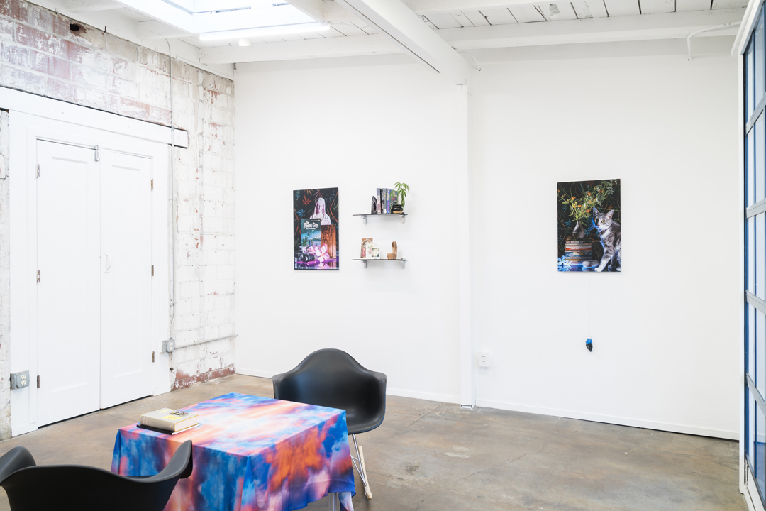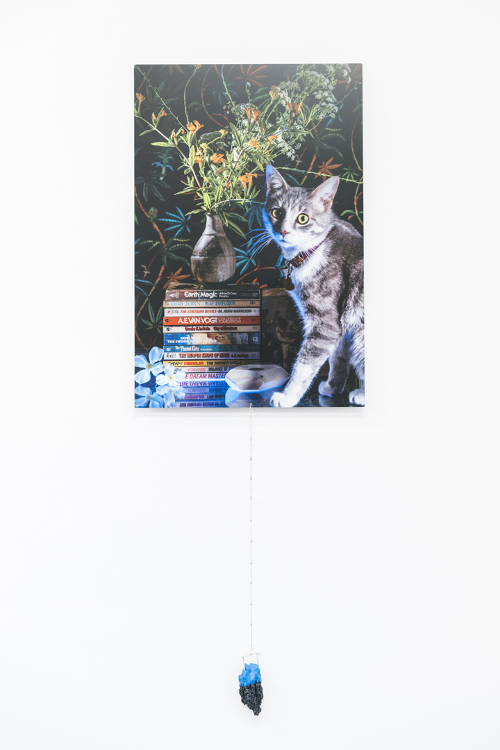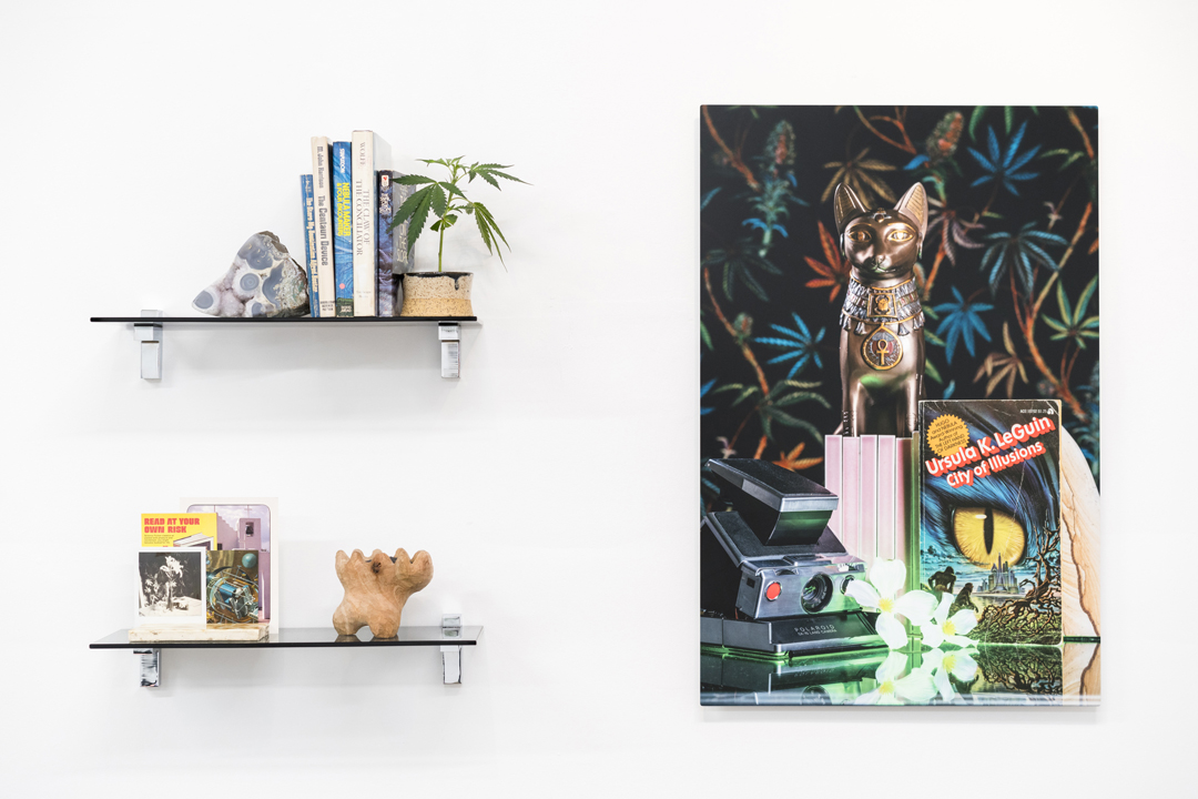 Alvarez-Perez skillfully utilizes open-endedness, providing space for an unhurried exploration of his constructions of images and objects. In Existential Coping Complex II (City of Illusions) (2017), a glass shelf displays a variety of items—old books, geodes, small ceramics, and a potted sativa plant—next to an unframed print on aluminum. Looking through everything feels familiar, like perusing a friend’s living-room bookcase, or items in a boutique. In the nearby image, a Polaroid camera and loose flowers are illuminated by a vivid, electric green light. Standing upright is a copy of Ursula K. LeGuin’s book City of Illusions, whose cover features a large, moonlike cat eye. Towering over pale pink ceramic pieces (which physically appear in another work, titled Existential Coping Complex I) is a sculpture of a cat wearing Egyptian adornments. The cat is the most central aspect of the image, and leads the eye to a backdrop of soft-focus marijuana leaves.