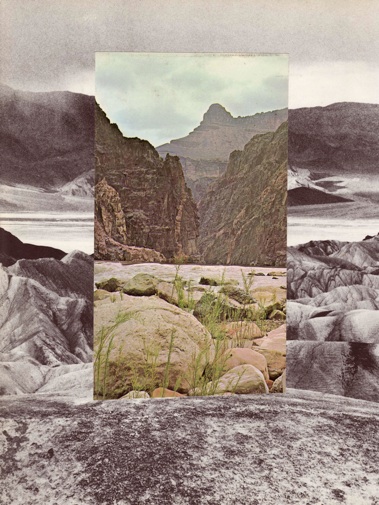 BNR: As far as for the simplicity, the New Ridge collage. It’s what I consider a ready-made collage. It’s just one book page cut and placed on top of another, and it’s titled New Ridge because I had cut out a photograph of a range of mountains and had another page taken from a different book from a different time and a different locale. When I placed the cut image onto the base image, I was able to line it up so that the beginning of the ridge on either side intersected to create a new ridge.