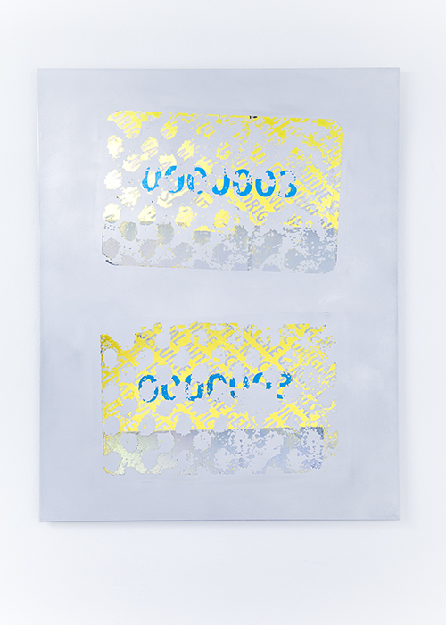August 16 - September 14, 2014 Solo ShowFor his Number Sea exhibition at Important Projects, which was also the space’s last, Derek Frech takes the larger of the two rooms and presents three works with security as the theme. Digital video 9 Pin Bright is a black-and-white loop comprising an undulating dot-matrix pattern that calls to mind tests for color blindness. One must look closely to see the changes taking place as the dots momentarily merge to create patterns and shapes, such as a 12-key keypad one sees on telephones or building security systems. Two nearly identical standing pieces comprise Number Sea 1 & 2, which incorporates data-center server rack stands, special tamper-proof bolts, and outdoor painters’ netting with a camouflage-like white print on each structure. The final piece, Tamper Evident Type I #000002, is a transfer print on aluminum of a theme from Frech’s previous Moroso Projects show: two enlarged product-security stickers, typically used on personal electronic goods in retail settings to warn that if tampered with, the product’s warranty will be voided.