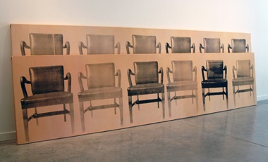 Jury Box, 2010; screen print and acrylic on canvas, 50 x 156 x 10 in. Courtesy of the Artist and Ping Pong Gallery, San Francisco.