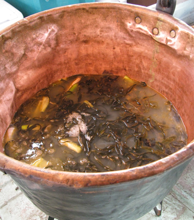 Briny consommé of Pacific seafood and seaweed simmering in a boat at OPENwater. Photo: Stephanie Perez.