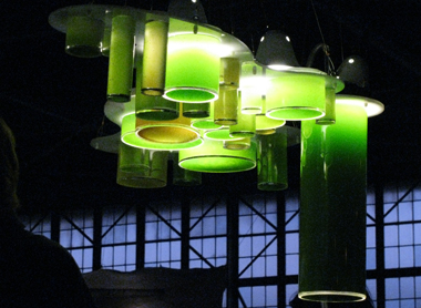 The artwork and public presentations at OPENwater were curated by the trio Amanda Eicher, Rosie Branson Gill, and Valerie Imus. Underneath the stills was TheTank, a conversation and presentation space created by the Perish Trust that was ringed by numerous artworks. Activities in TheTank ranged from classes on salt preservation, conversations on cartography, and curator-led poker games. Most notable were a series of living installations by microbiologist and artist Denise King. Phytoplankton Bloom: Isochrysis, Nannochloropsis, Desmodesmus, Tetraselmis are self-sustaining biomes of algae drifting in a chandelier of cylindrical tanks.