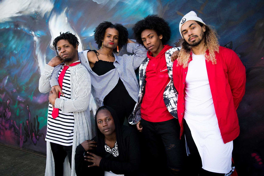 Black Bois artists (left to right (Markeith Wiley, Mychael Hodges, Randy Ford, Cipher Goings, Michael O’Neal, Jr). Courtesy of On The Boards. Photo: Naomi Ishisaka